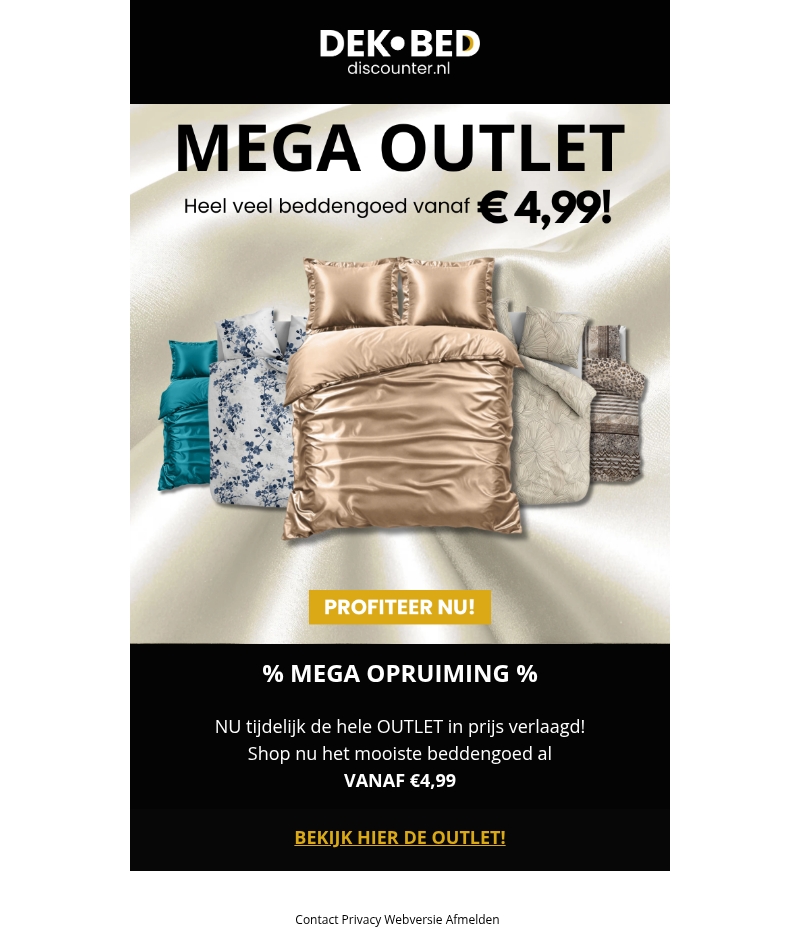 Ontdek geweldige kortingen op beddengoed tijdens de Mega Outlet van Dekbed Discounter. Kwaliteit sets beginnen al vanaf €4,99. Mis deze kans niet om je slaapkamer een luxe uitstraling te geven zonder de bank te breken. De actie is tijdelijk, dus wees snel! Bezoek de outlet via de link en shop jouw favoriete designs.