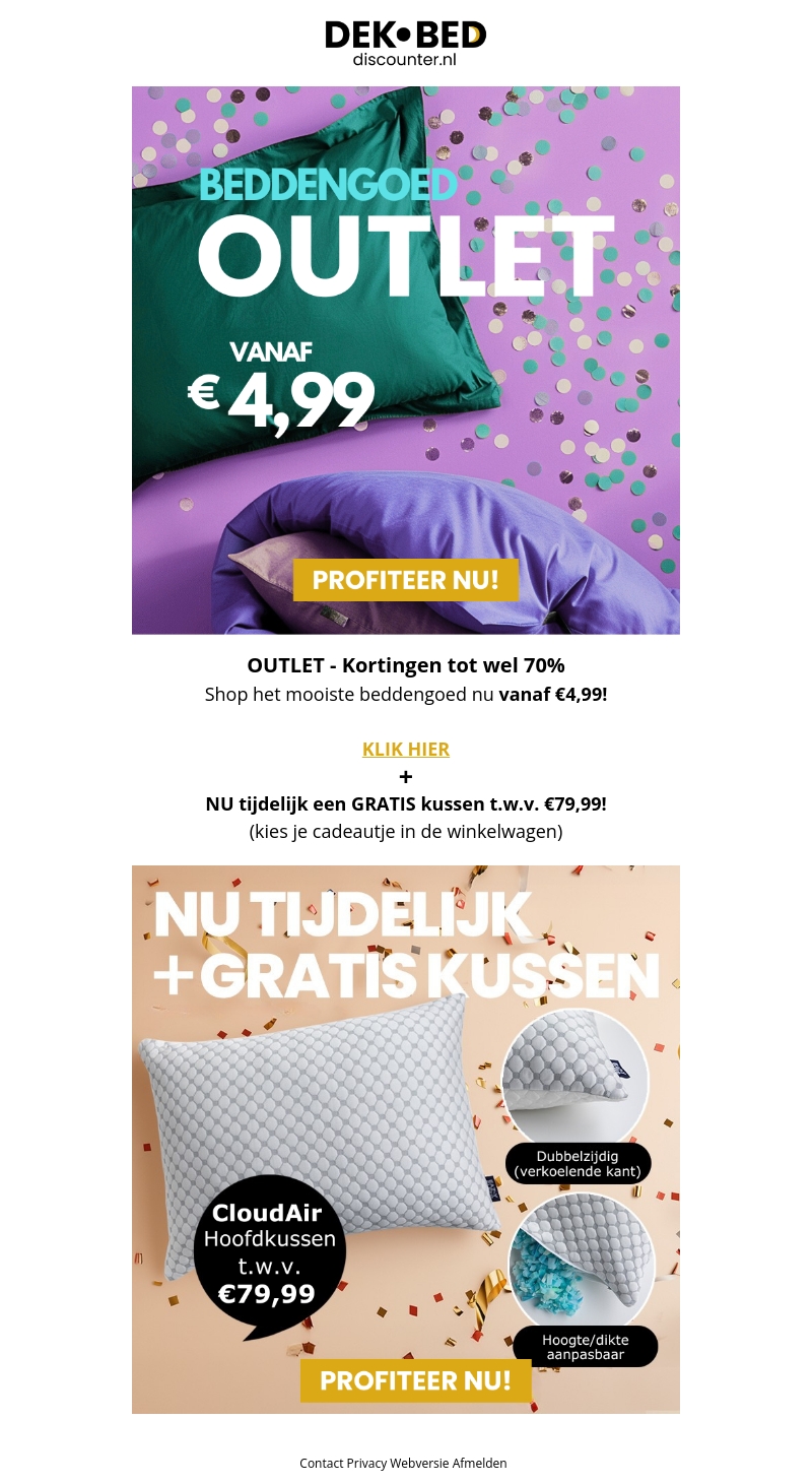 Profiteer nu van geweldige kortingen tot wel 70% bij Dekbed Discounter. Shop het mooiste beddengoed vanaf slechts €4,99! Als een extra cadeau krijg je tijdelijk een gratis kussen ter waarde van €79,99. Mis deze unieke kans niet en verwen jezelf vandaag nog.
