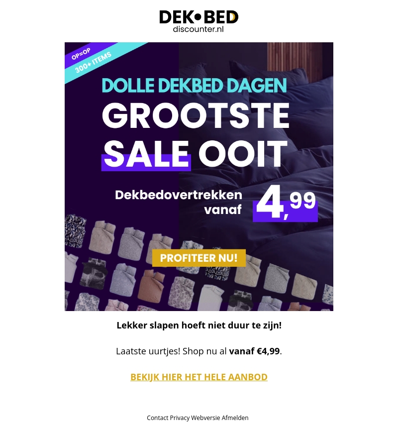 Mis de grootste dekbed sale ooit bij Dekbed-Discounter niet! Geniet van dolle dekbed dagen met dekbedovertrekken vanaf slechts €4,99. Deze geweldige aanbiedingen gelden alleen voor de laatste uurtjes. Slaap lekker zonder dat het duur hoeft te zijn. Ons assortiment bestaat uit meer dan 300 items. Bekijk het hele aanbod nu en profiteer van scherpe kortingen!