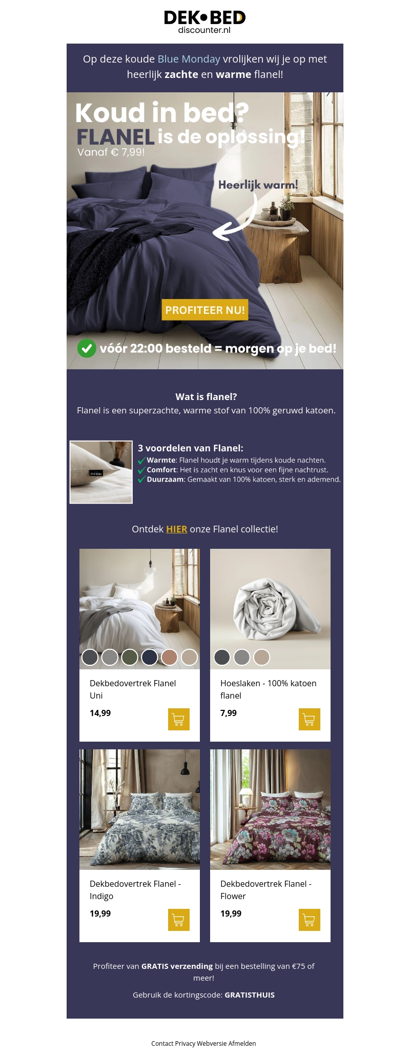 Heb je last van een koude Blue Monday? Met onze warme en zachte flanel maak je alles beter! Voor slechts β¬ 7,99 geniet je van de beste kwaliteit flanel beddengoed. Snelle levering als je voor 22:00 bestelt. Profiteer nu van gratis verzending bij besteding vanaf β¬75 en gebruik de kortingcode voor extra voordeel.