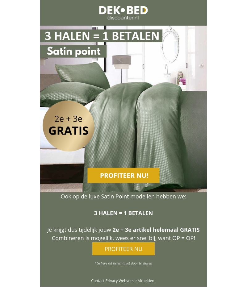 Ontvang nu een geweldige aanbieding bij Dekbed Discounter: bij aankoop van 3 luxe Satin Point beddengoedsets betaal je er maar ÊÊn. De tweede en derde sets krijg je gratis! Mis deze kans niet om je slaapkamer stijlvol en comfortabel in te richten.