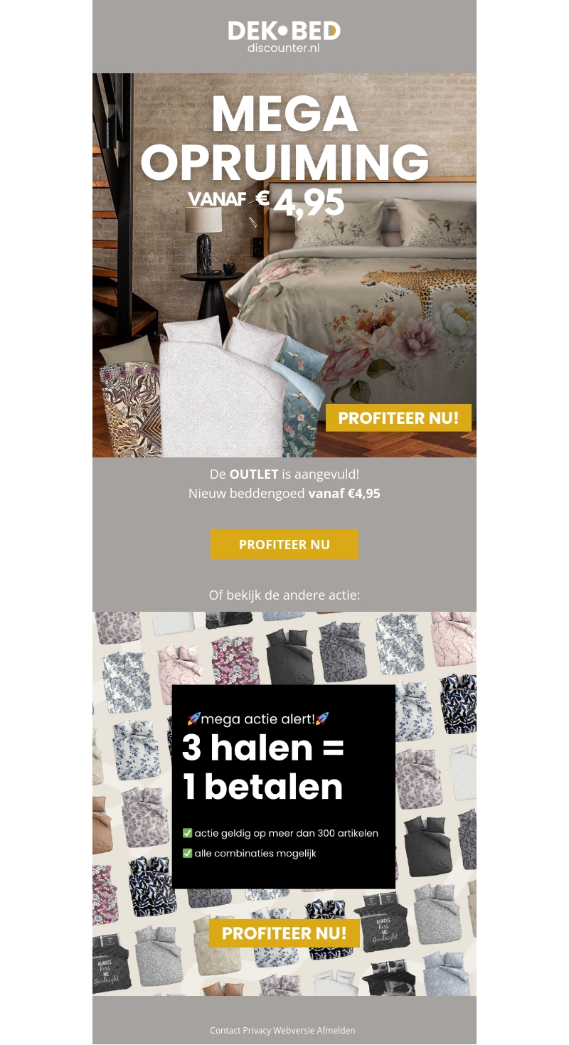 Dekbed Discounter lanceert een mega opruiming met prijzen vanaf slechts €4,95. Ontdek schitterend nieuw beddengoed en profiteer van unieke deals. Mis de kans niet om meer dan 300 artikelen te verkennen waarbij de speciale actie '3 halen = 1 betalen' van toepassing is. Alle combinaties zijn mogelijk, dus kies uw favorieten en upgrade uw slaapkamer! Deze aanbiedingen gelden slechts voor een beperkte tijd.