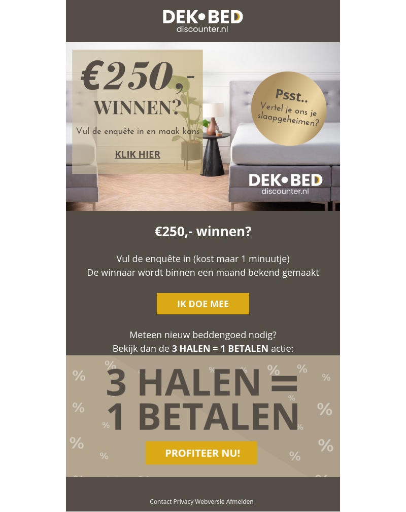 Vul onze korte enquête in en maak kans op €250,-. De winnaar wordt binnen een maand bekendgemaakt! Daarnaast hebben we een geweldige aanbieding voor je: 3 halen, 1 betalen op al ons beddengoed. Doe mee en profiteer nu!