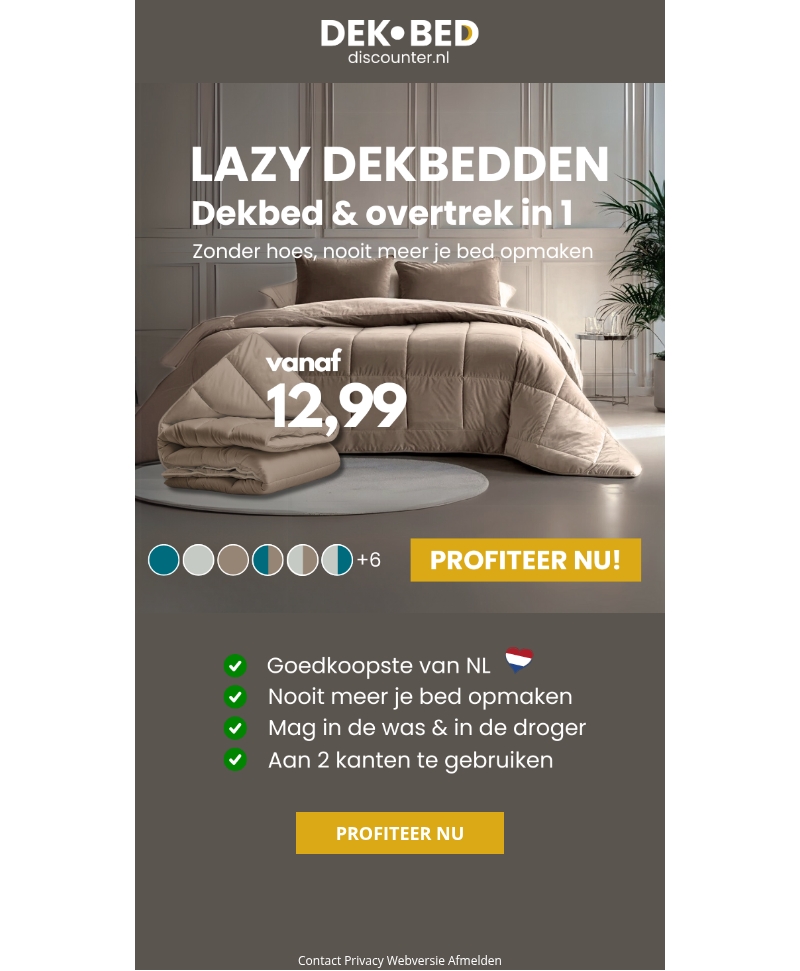 Verhoog je slaapervaring met de ongelooflijk handige Lazy Dekbedden. Met prijzen vanaf slechts €12,99 biedt deze acties set een dekbed en overtrek in één! Bespaar tijd en moeite, want je hoeft je bed nooit meer op te maken. Geniet van de veelzijdigheid met hoezen die je kunt wassen en drogen. Mis deze voordelige deal niet!