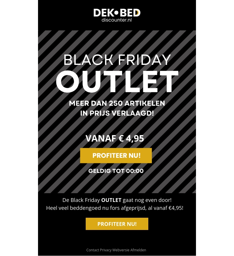 Ontdek enorme kortingen bij de Dekbed Discounter Black Friday outlet. Meer dan 250 artikelen, inclusief beddengoed, zijn sterk in prijs verlaagd. Deze geweldige deals beginnen al vanaf €4,95 en zijn geldig tot middernacht. Mis deze kans niet om uw slaapkamer te upgraden met stijlvolle en betaalbare opties.