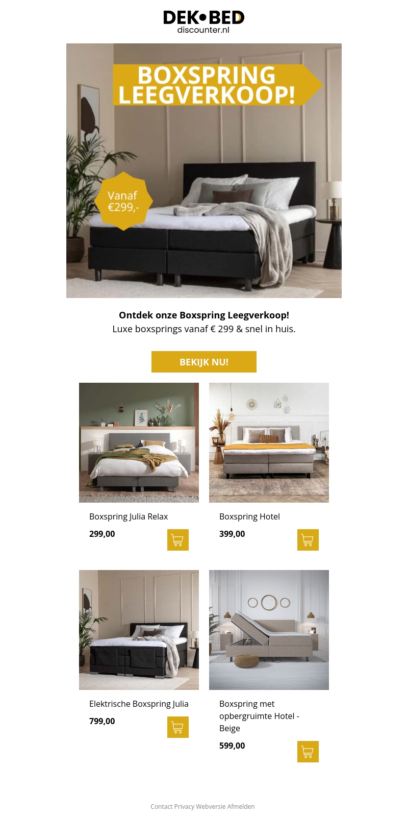 Profiteer nu van de grote boxspring leegverkoop bij Dekbed Discounter! Luxe boxsprings zijn al beschikbaar vanaf slechts €299. Deze indrukwekkende aanbiedingen zijn voor een beperkte tijd geldig, dus wees er snel bij! Ontdek het comfort en de stijl die perfect passen in uw slaapkamer.