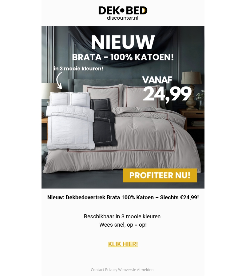 Maak je slaapkamer compleet met het nieuwe Brata dekbedovertrek. Gemaakt van 100% katoen en verkrijgbaar in drie prachtige kleuren. Vanaf slechts €24,99 kun je nu profiteren van deze stijlvolle en comfortabele set. Wacht niet te lang, want op = op! Klik hier om jouw favoriet te bestellen.