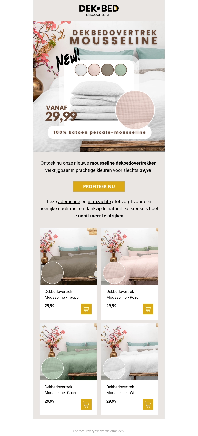 Ontdek onze nieuwe mousseline dekbedovertrekken, beschikbaar in prachtige kleuren. Geniet van een heerlijke nachtrust dankzij de ademende en ultrazachte stof. Deze dekbedovertrekken zijn gemaakt van 100% katoen percale-mousseline. Dankzij de natuurlijke kreukels hoeft u nooit meer te strijken. Verfraai uw slaapkamer voor een scherpe prijs. Verkrijgbaar vanaf slechts 29,99!