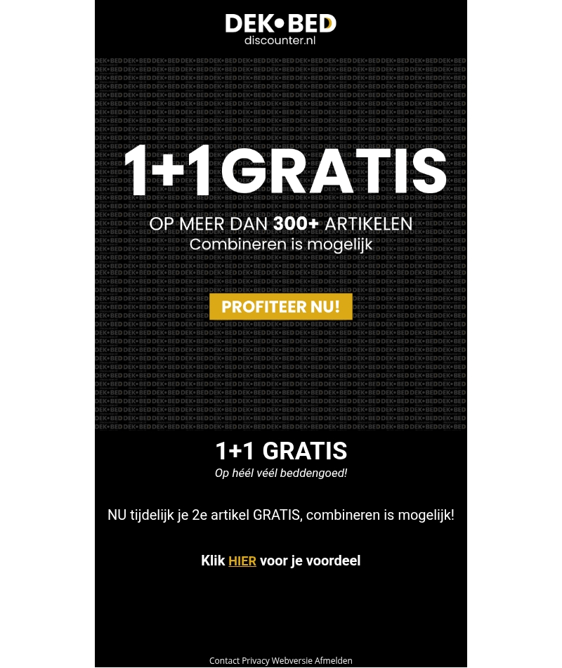 Ontdek de nieuwste 1+1 gratis actie bij Dekbed Discounter. Kies uit meer dan 300 artikelen en krijg je tweede artikel gratis. Combineer zoals je wilt en profiteer direct!