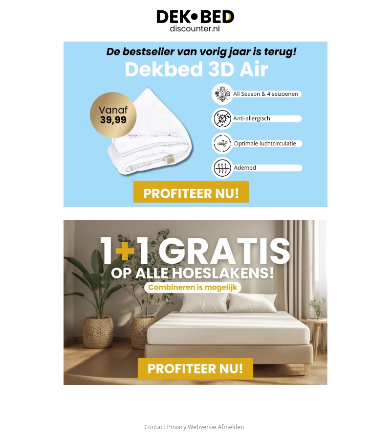 Het bestverkochte dekbed van vorig jaar is terug! Het Dekbed 3D Air biedt anti-allergene bescherming en optimale luchtcirculatie. Geniet nu van een geweldige 1+1 gratis aanbieding op alle hoeslakens. Combineer en profiteer van de extra voordelen. Ideaal voor elk seizoen en met ademend materiaal.