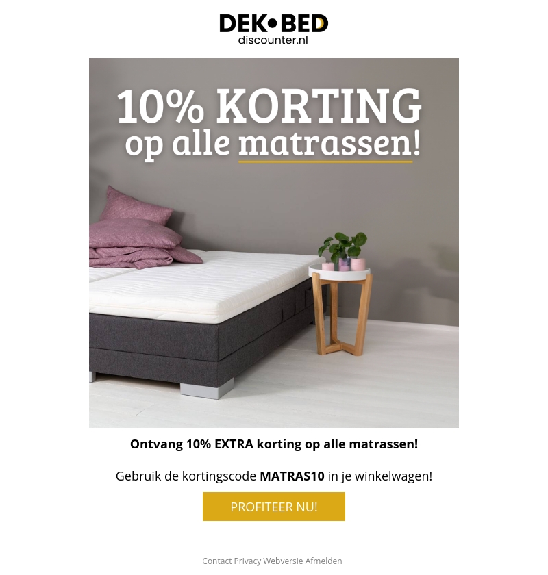 Mis deze kans niet om 10% korting te krijgen op alle matrassen van Dekbed Discounter. Gebruik de kortingscode MATRAS10 bij het afrekenen. Of je nu op zoek bent naar een nieuw bed of gewoon je huidige wil upgraden, nu is het moment. Deze aanbieding geeft je extra voordeel voor een betere nachtrust. Zorg dat je snel profiteert en ontdek ons ruime assortiment. Wacht niet te lang, want de voorraad is beperkt!