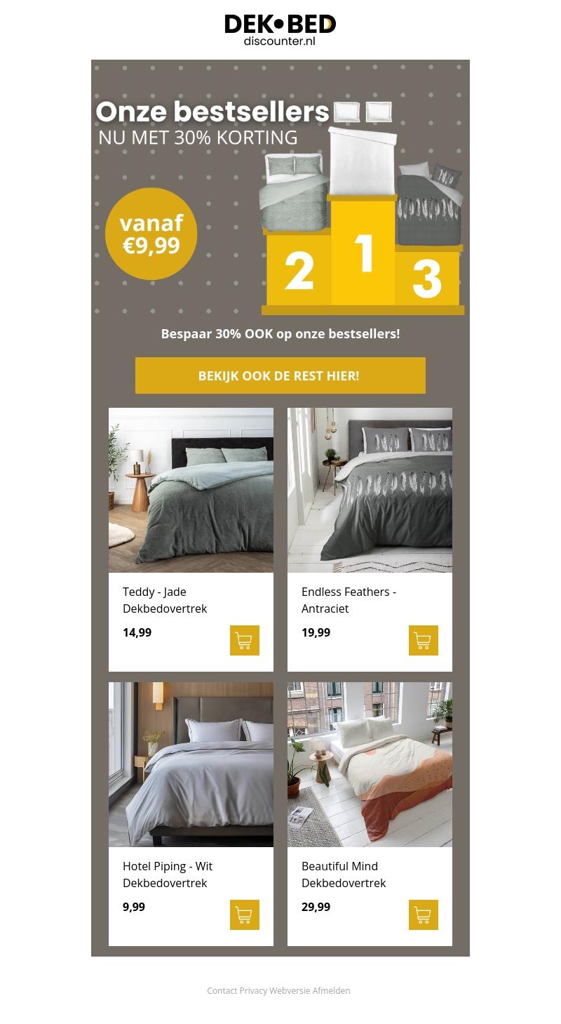 Ontdek nu onze bestsellers met een korting van 30%! Dekbedden verkrijgbaar vanaf slechts €9,99. Bespaar op je favoriete producten zoals Teddy - Jade, Endless Feathers - Antraciet, en meer. Mis deze kans niet en vernieuw je slaapkamerstijl vandaag nog.