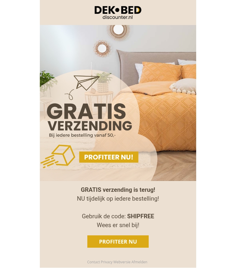 Dekbed Discounter biedt tijdelijk gratis verzending aan op iedere bestelling vanaf 50 euro. Gebruik de code SHIPFREE om direct te profiteren van deze aanbieding. Wees er snel bij, want deze actie is slechts tijdelijk geldig. Maak je slaapkamer compleet met onze luxe dekbedden en accessoires. Ontdek het assortiment nu en geniet van het voordeel.