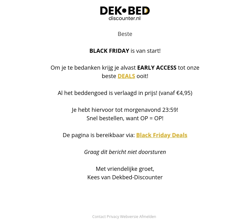 Black Friday is begonnen bij Dekbed-Discounter, en als bedankje krijg je vroegtijdige toegang tot de beste deals! Profiteer van verlaagde prijzen op al het beddengoed, al vanaf €4,95. Mis deze kans niet; de aanbieding is slechts geldig tot morgenavond 23:59 uur. Bestel snel, want op = op!