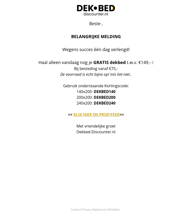 Haal vandaag nog een gratis dekbed t.w.v. β¬149 bij besteding vanaf β¬75. De voorraad is bijna op, dus mis het niet! Gebruik de kortingscode die past bij jouw gewenste maat en profiteer nu.