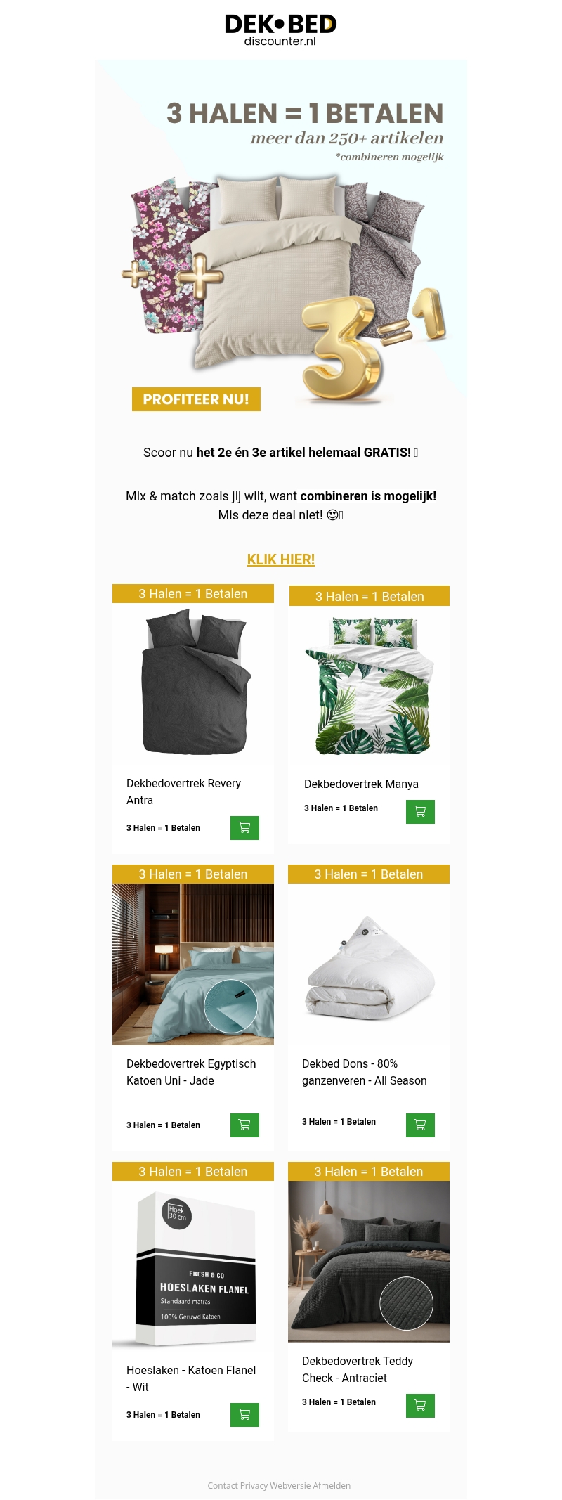 Bij Dekbed Discounter profiteer je nu van een unieke actie: koop drie artikelen en betaal er slechts één! Deze aanbieding geldt voor meer dan 250 producten. Combineer verschillende artikelen naar keuze en mis deze kans niet. Bekijk snel de collectie en shop jouw favoriete dekbedden, lakens en meer.