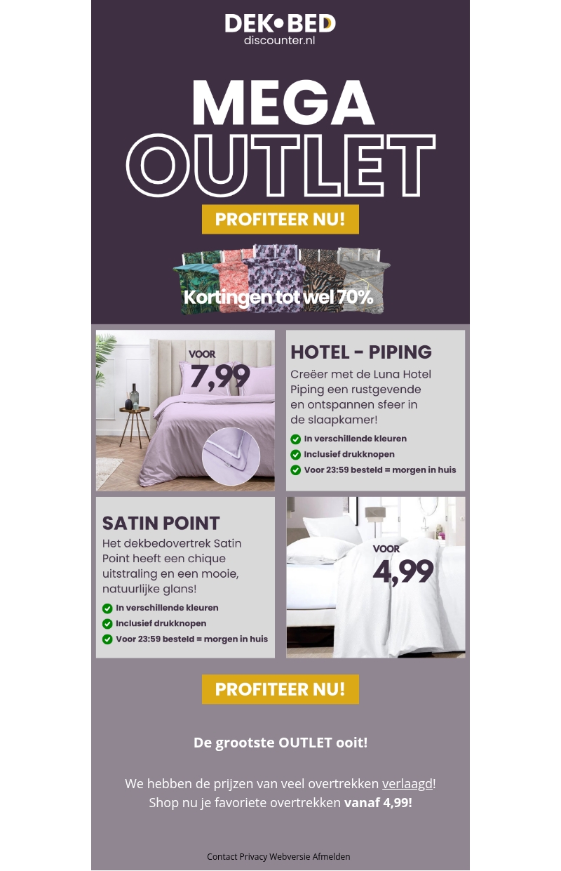 Ontdek de grootste outlet ooit bij Dekbed Discounter met kortingen tot 70%. Profiteer van aanbiedingen op luxe dekbedovertrekken zoals Hotel - Piping en Satin Point vanaf slechts β¬4,99. Haal snel je favoriete set in huis, want op=op!
