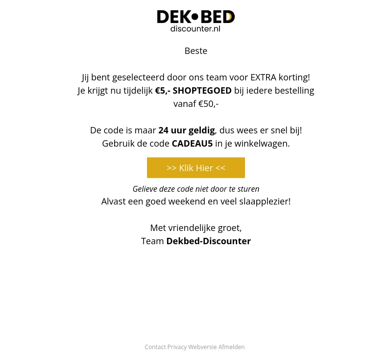 Gefeliciteerd! Jij bent geselecteerd door Dekbed-Discounter voor extra korting. Ontvang tijdelijk €5,- shoptegoed bij elke bestelling vanaf €50,-. Wees er snel bij, want de code is slechts 24 uur geldig. Gebruik de code CADEAU5 in je winkelwagen.