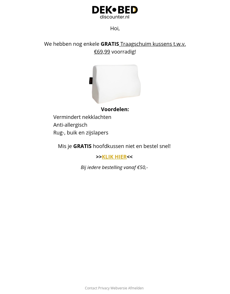 Hoi, we hebben nog enkele gratis traagschuim kussens t.w.v. €69,99 op voorraad. Ze verminderen nekklachten, zijn anti-allergeen en geschikt voor rug-, buik- en zijslapers. Mis je kans niet en bestel snel bij een bestelling vanaf €50.