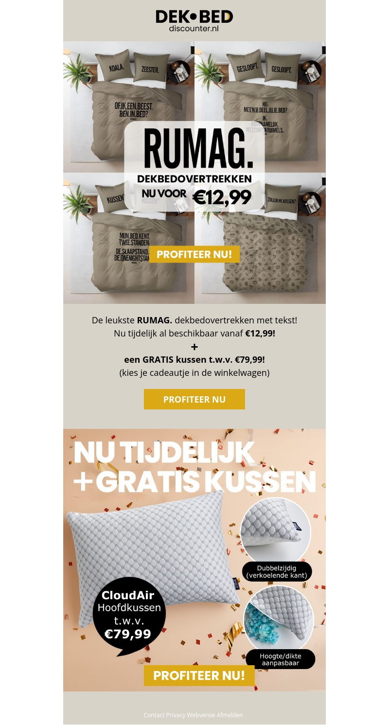 Profiteer nu van de leukste RUMAG. dekbedovertrekken met tekst voor slechts €12,99. Deze aanbieding omvat ook een gratis kussen ter waarde van €79,99. Kies je cadeautje gemakkelijk in de winkelwagen. De dekbedovertrekken zijn stijlvol en uniek. Wees er snel bij want op is op!