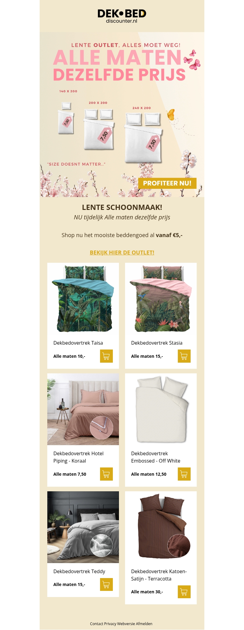 Dekbeddiscounter heeft een geweldige lente-uitverkoop waarbij alle maten dekbedovertrekken dezelfde prijs hebben. Kies uit een breed scala aan ontwerpen en materialen, geschikt voor elk interieur. Of je nu houdt van levendige patronen of stijlvolle effen kleuren, er is voor ieder wat wils. Deze aanbieding geldt tijdelijk en geeft je de kans om luxe en comfort in je slaapkamer te brengen tegen een scherpe prijs. Ontdek nu de collectie en maak gebruik van de speciale aanbiedingen.