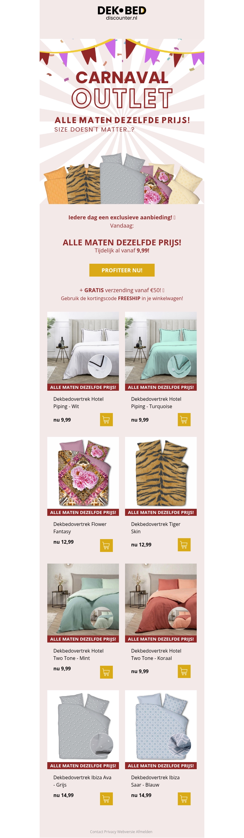 In de Carnaval Outlet van Dekbed Discounter blijven alle maten dezelfde prijs. Dit is het moment om uw slaapkamer om te toveren met diverse dekbedovertrekken. Van bloemenprints tot effen kleuren, alles is mogelijk vanaf slechts €9,99. Geniet van gratis verzending bij een bestelling van minimaal €50. Profiteer nu en haal de beste deals in huis.