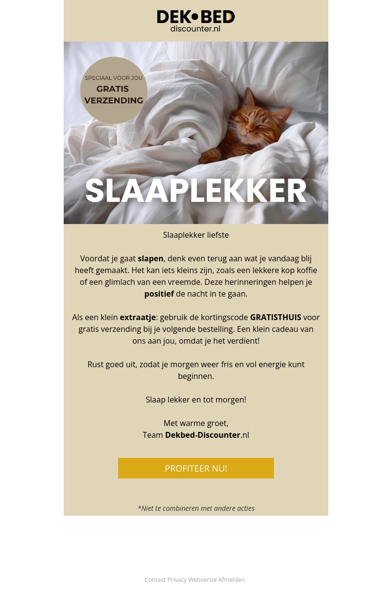 Slaaplekker liefste! Denk terug aan wat je vandaag blij heeft gemaakt en ga positief de nacht in. Gebruik de kortingscode GRATISTHUIS voor gratis verzending bij je volgende bestelling. Rust goed uit en begin morgen fris en vol energie. Slaap lekker!