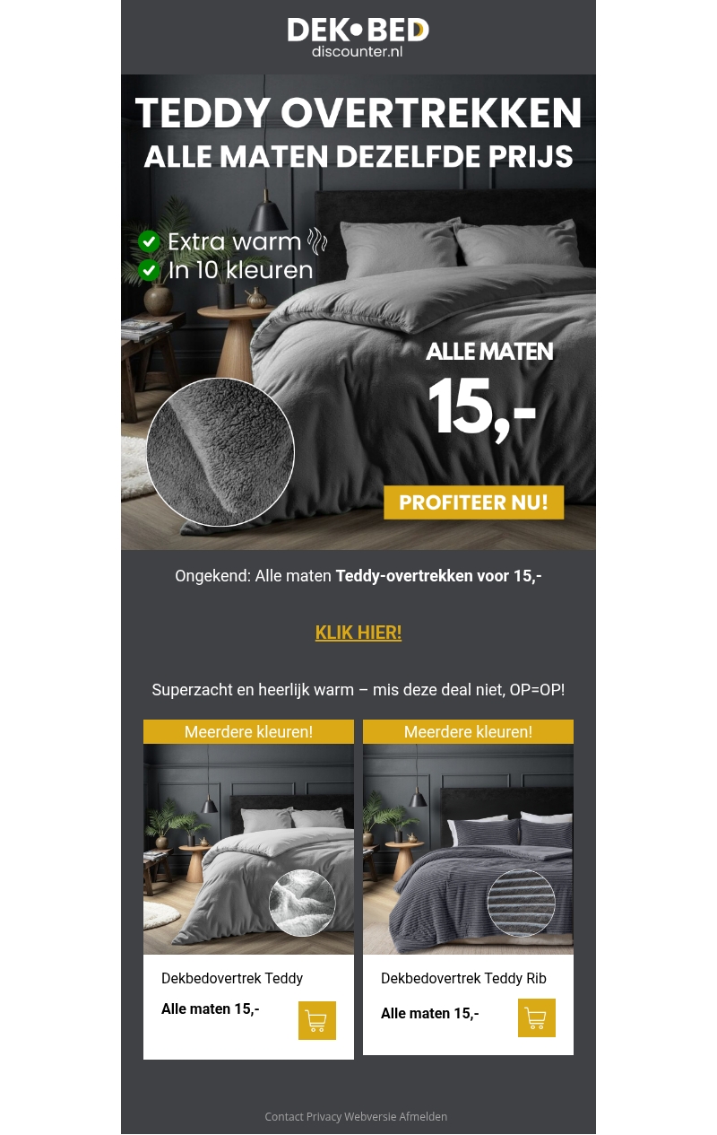 Profiteer nu van onze aanbieding op Teddy dekbedovertrekken. Voor slechts €15 krijg je een heerlijk warm en zacht overtrek, verkrijgbaar in 10 kleuren. Deze deal geldt voor alle maten, dus mis het niet!