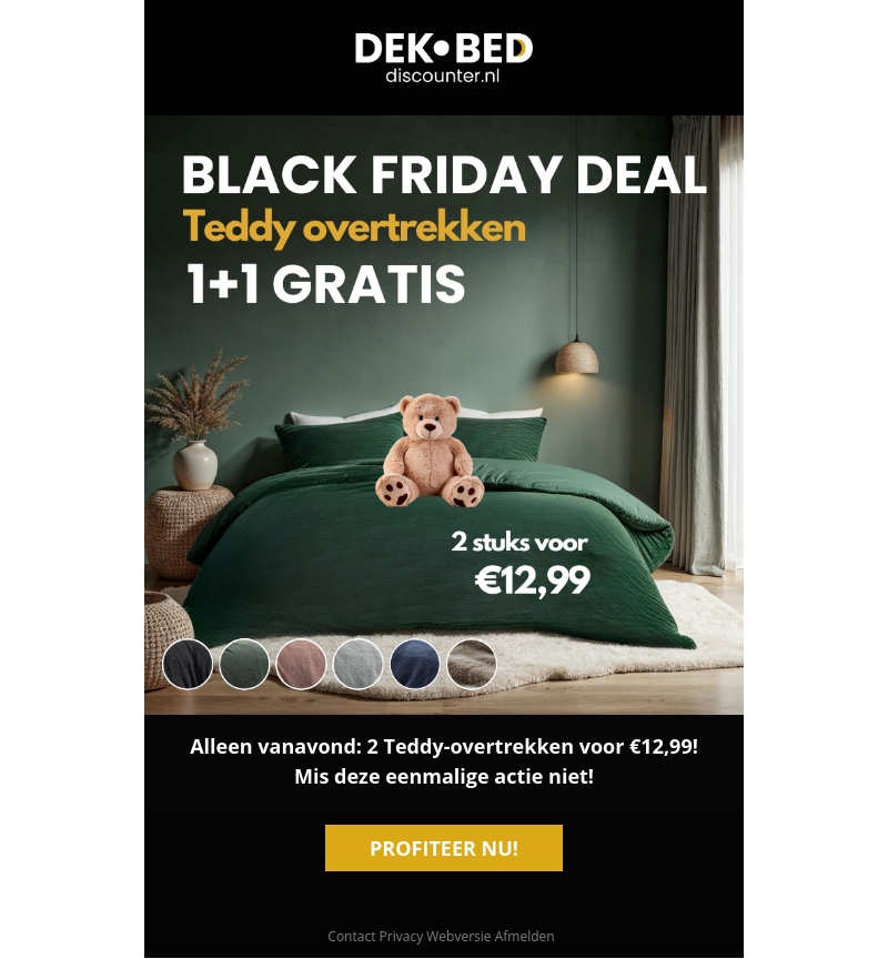 Profiteer van onze exclusieve Black Friday deal en krijg 1+1 gratis op Teddy overtrekken. Alleen vandaag kunt u twee stuks krijgen voor slechts €12,99. Deze zachte en comfortabele overtrekken zijn verkrijgbaar in diverse kleuren. Mis deze unieke kans niet en verfraai uw slaapkamer vandaag nog.