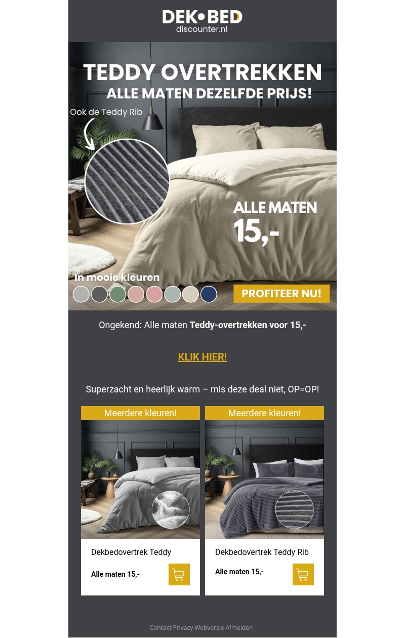 De zachte en warme Teddy dekbedovertrekken zijn nu in de aanbieding! Voor slechts €15, ongeacht de maat, kunt u kiezen uit diverse prachtige kleuren. Mis deze kans niet om uw slaapkamer een comfortabele en stijlvolle upgrade te geven. OP=OP dus wees er snel bij. Klik nu en bekijk het assortiment!