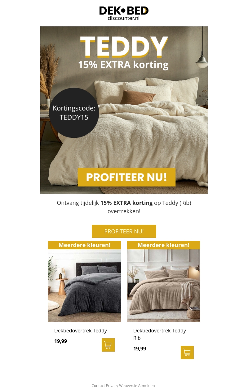 Grijp nu je kans om zachte Teddy en Rib dekbedovertrekken met 15% korting te verkrijgen. Beschikbaar in meerdere kleuren voor een warme en luxe uitstraling in je slaapkamer. Mis de aanbieding niet, deze dekbedovertrekken zijn nu slechts €19,99. Gebruik de kortingscode TEDDY15 voor extra voordeel. Maak je slaapkamer compleet met de ultieme comfortstijl. Wees er snel bij, zolang de voorraad strekt.