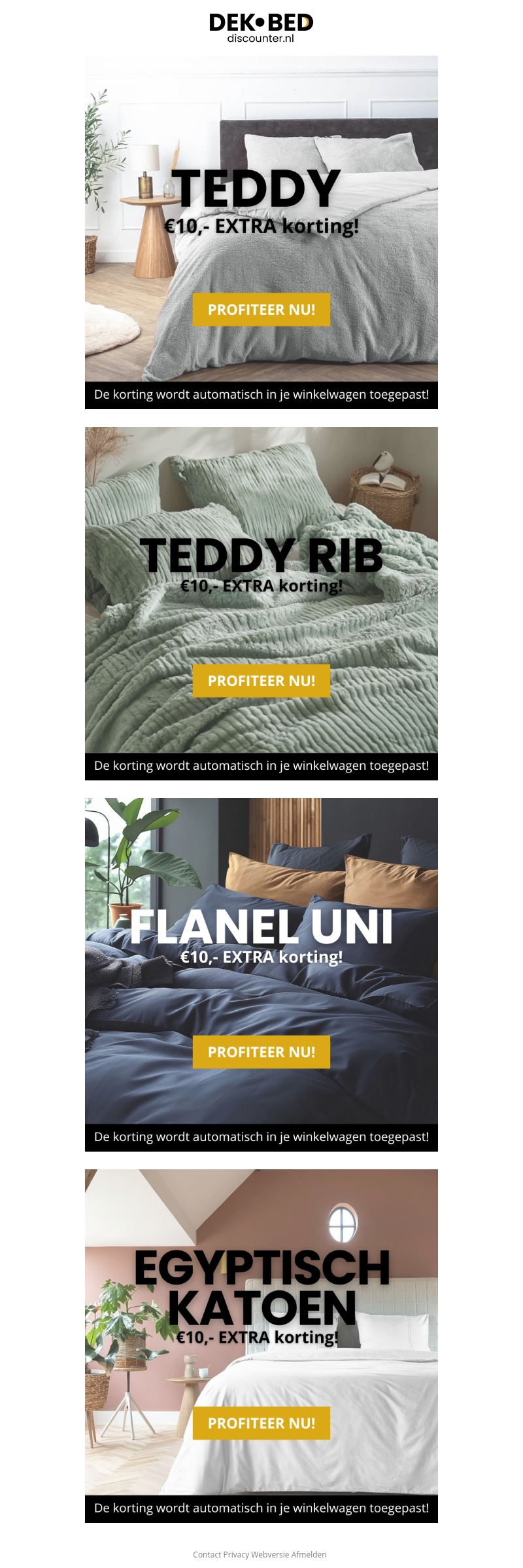 Profiteer nu van fantastische kortingen op diverse beddengoedsets bij DekbedDiscounter.nl! Teddy, Teddy Rib, Flanel Uni en Egyptisch Katoen zijn nu allemaal met €10 extra korting. De korting wordt automatisch in je winkelwagen toegepast. Slaap comfortabel en stijlvol met deze zachte en luxe dekbedovertrekken.