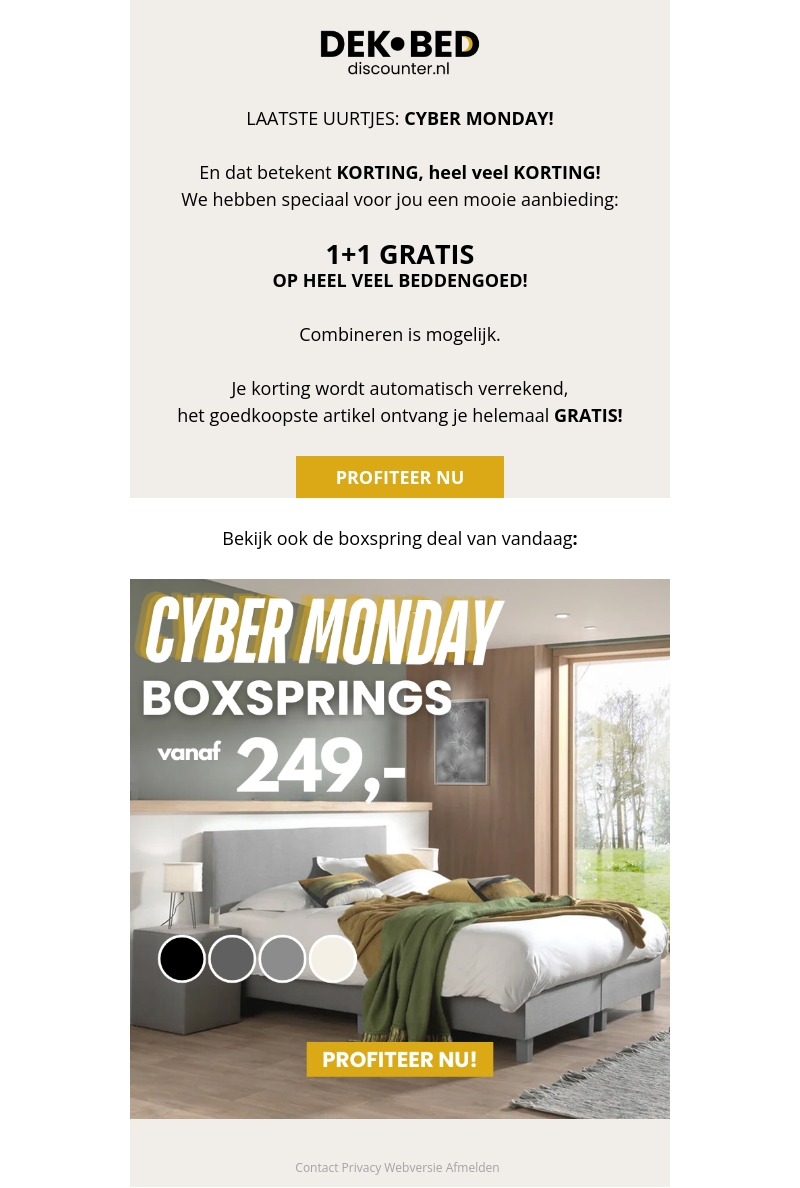 Geniet van de beste Cyber Monday deals bij Dekbed Discounter. Scoor 1+1 gratis op veel beddengoed en ontdek boxsprings vanaf slechts €249. De korting wordt automatisch verrekend en combineren is mogelijk. Mis deze kans niet om uw slaapkamer te vernieuwen met kwaliteitsproducten. Profiteer nu van deze fantastische aanbiedingen!