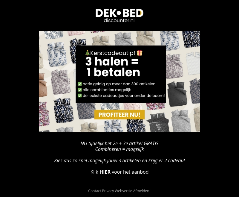 Dekbed Discounter biedt een fantastische kerstcadeautip met hun 3 halen = 1 betalen actie op meer dan 300 artikelen. Combineer verschillende stijlen en creΓ«er het perfecte cadeau voor onder de boom. Tijdelijk is het 2e en 3e artikel gratis, dus mis het niet!
