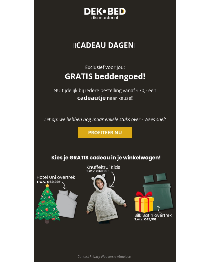Geniet van de cadeaudagen bij DEK-BED. Ontvang gratis beddengoed bij elke bestelling vanaf β¬70. Kies jouw cadeau in de winkelwagen, variΓ«rend van luxe overtrekken tot knuffeltruien voor kinderen. Voor een beperkte tijd, dus wees er snel bij!
