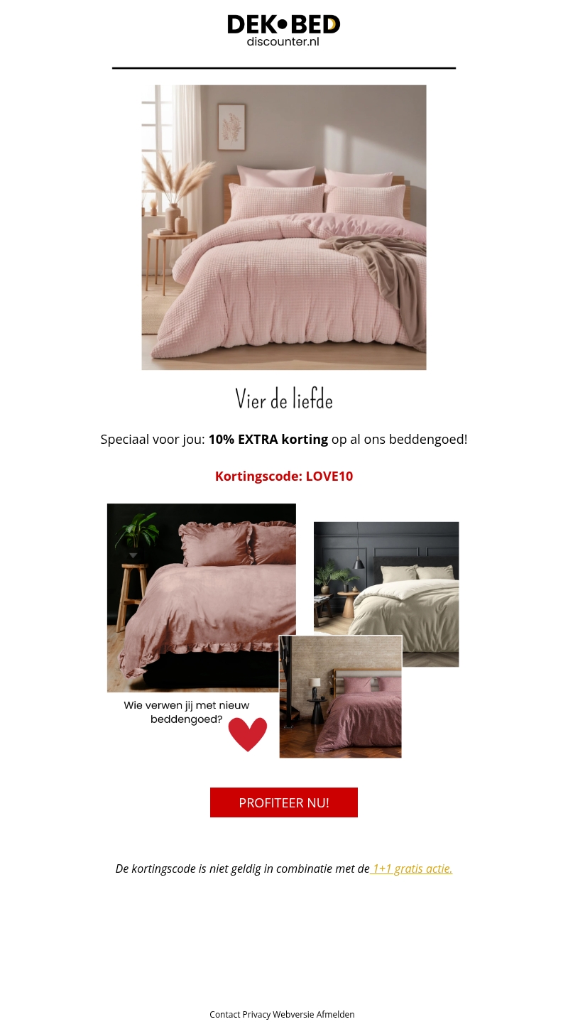 Valentijnsdag komt eraan en Dekbedovertrekken.nl heeft de perfecte aanbieding! Geniet van 10% extra korting op ons uitgebreide assortiment beddengoed. Gebruik de kortingscode LOVE10 om unieke geschenken te scoren voor je geliefden. Versier je slaapkamer met stijlvol en comfortabel beddengoed. Deze aanbieding is perfect voor een romantische make-over. Mis deze kans niet!