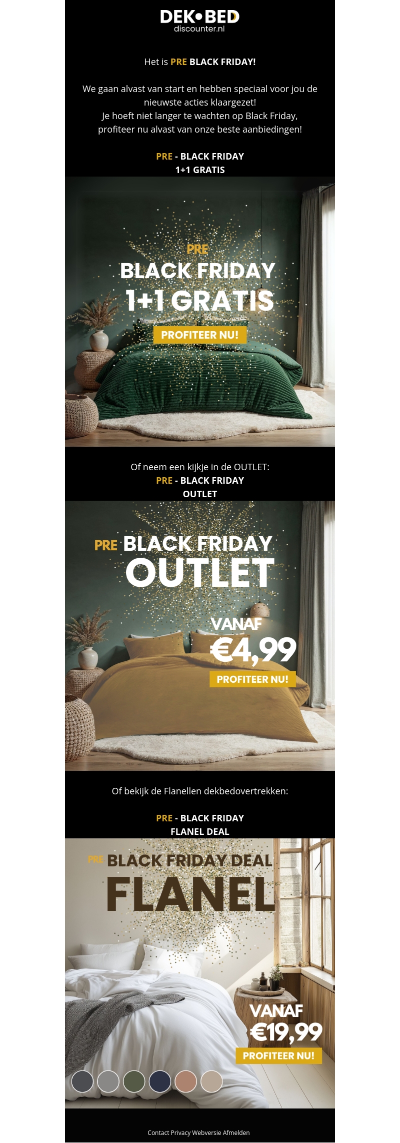 Het is tijd om te profiteren van de pre-Black Friday deals bij Dekbed Discounter. Geniet van 1+1 gratis op geselecteerde artikelen en ontdek de outlet voor producten vanaf €4,99. Speciale flanellen dekbedovertrekken zijn nu beschikbaar voor slechts €19,99. Mis deze kans niet om uw beddengoed collectie te vernieuwen.