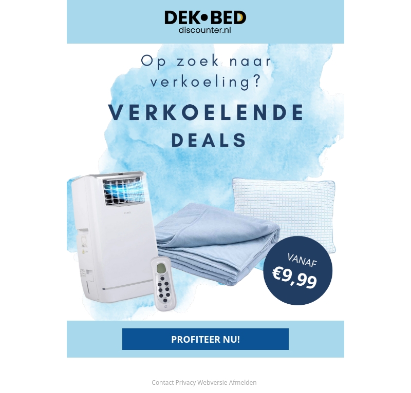 Ben je op zoek naar verkoeling deze zomer? Bekijk nu de verkoelende deals bij Dekbeddiscounter met prijzen vanaf slechts €9,99. Van ventilatoren tot koele lakens, wij hebben alles om je koel te houden.