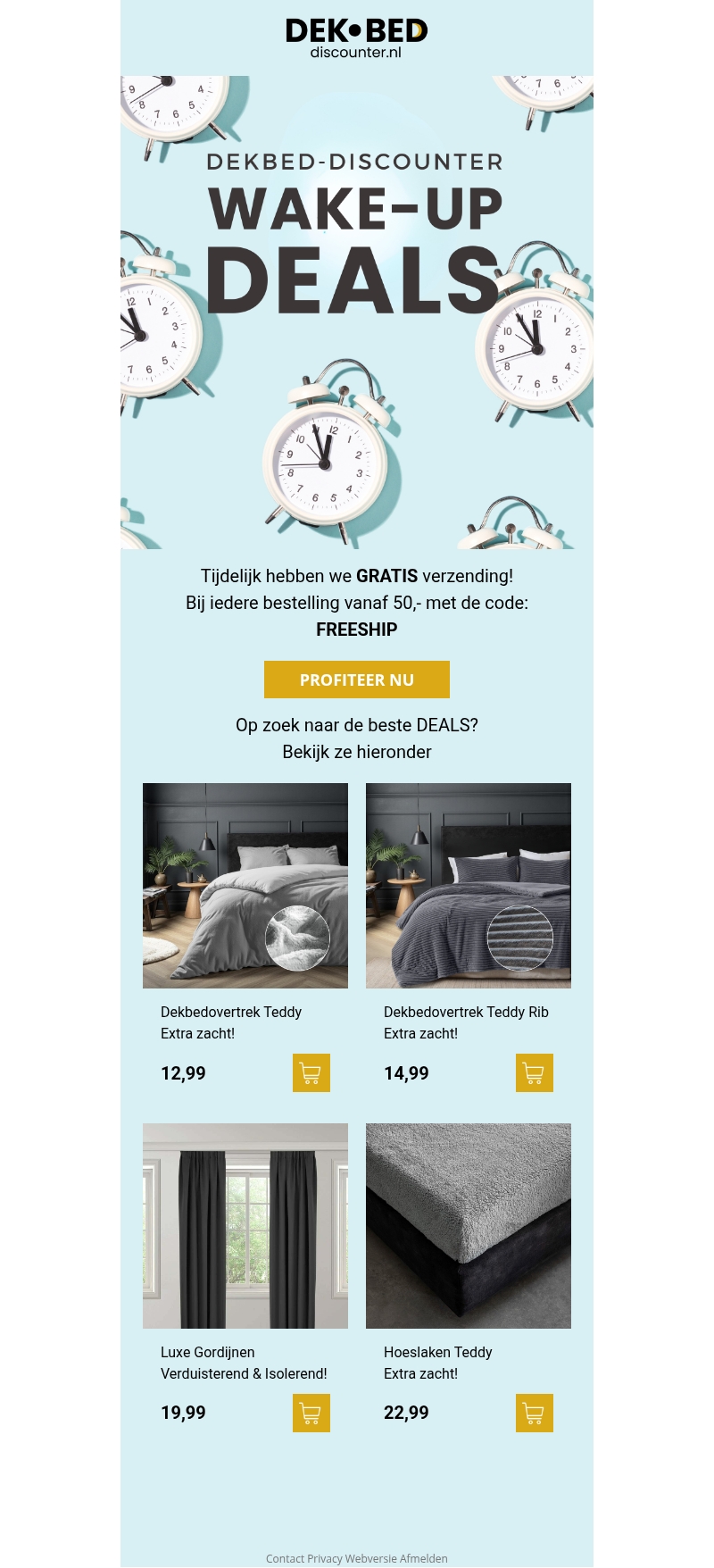 Mis deze wekelijkse Wake-up Deals niet bij Dekbed-Discounter! Ontvang tijdelijk gratis verzending op bestellingen vanaf €50 met de code FREESHIP. Ontdek onze zachte dekbedovertrekken en luxe verduisterende gordijnen. Vanaf slechts €12,99. Bekijk ons aanbod nu!