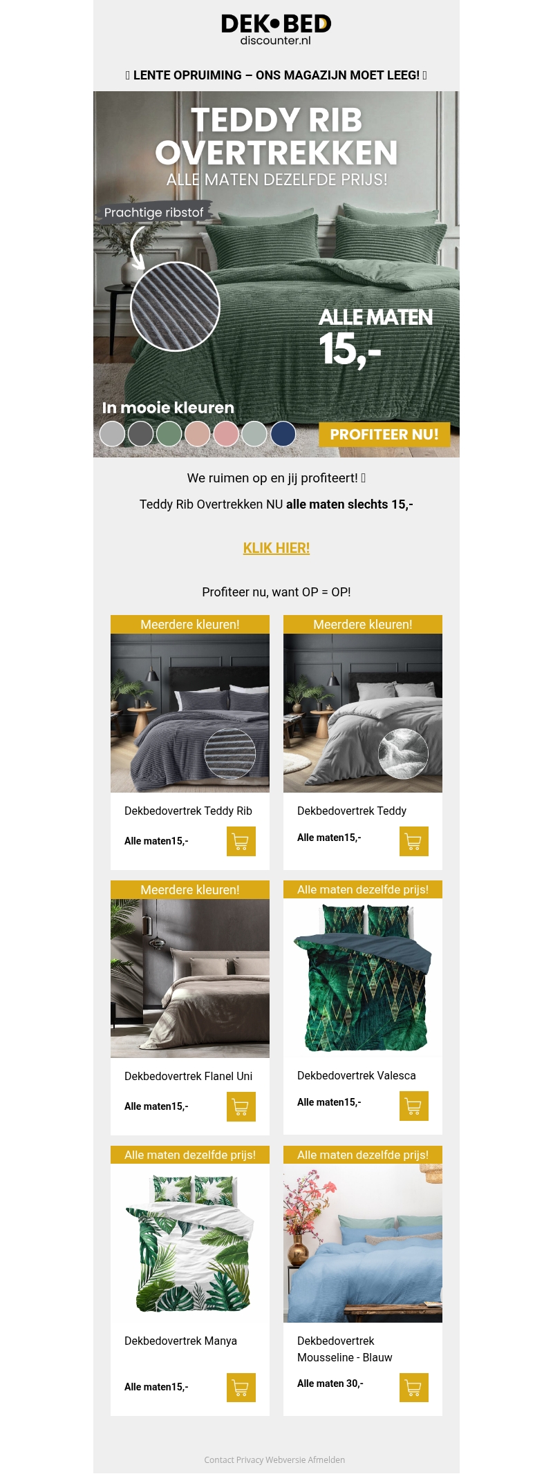 Dekbed Discounter ruimt op met een spectaculaire lente opruiming! Teddy Rib Overtrekken zijn nu verkrijgbaar in alle maten voor slechts 15,-. Profiteer van de unieke kans om kwaliteitsdekbedovertrekken in diverse kleuren te bemachtigen. Wees er snel bij, want op is op! Klik en shop jouw favoriete dekbedovertrek vandaag nog.