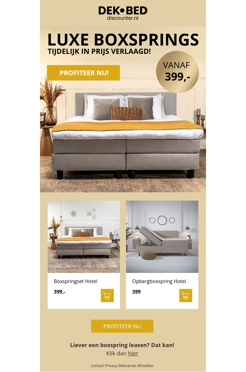 Ervaar het ultieme slaapcomfort met onze luxe boxsprings, nu tijdelijk in prijs verlaagd. Verkrijgbaar vanaf slechts €399. Mis deze kans niet en verbeter uw slaapkwaliteit vandaag nog.