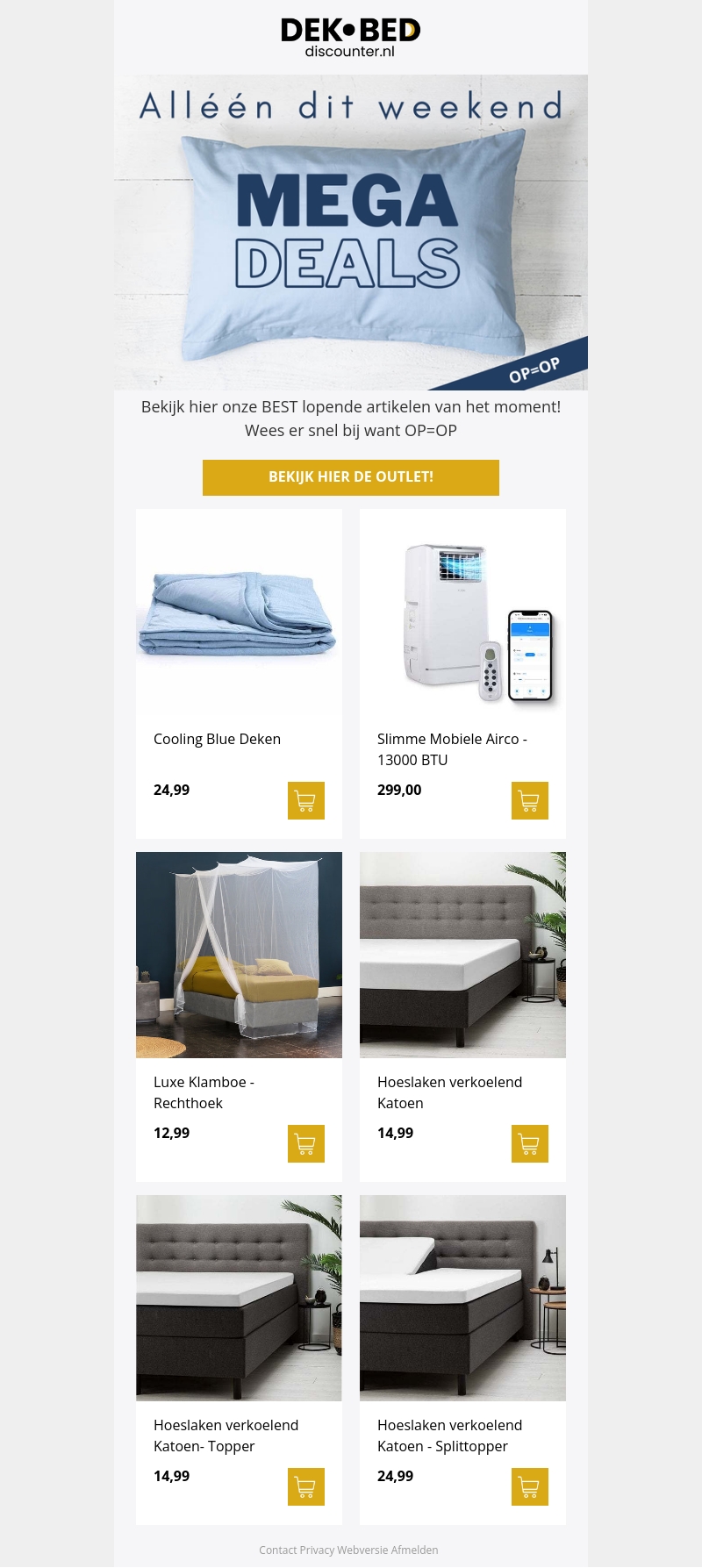 Alleen dit weekend biedt Dekbed-discounter mega deals op de best verkochte artikelen. Grijp jouw kans op topproducten zoals verkoelende dekens, slimme mobiele airco’s en luxe klamboes. Zorg dat je erbij bent, want op is op!