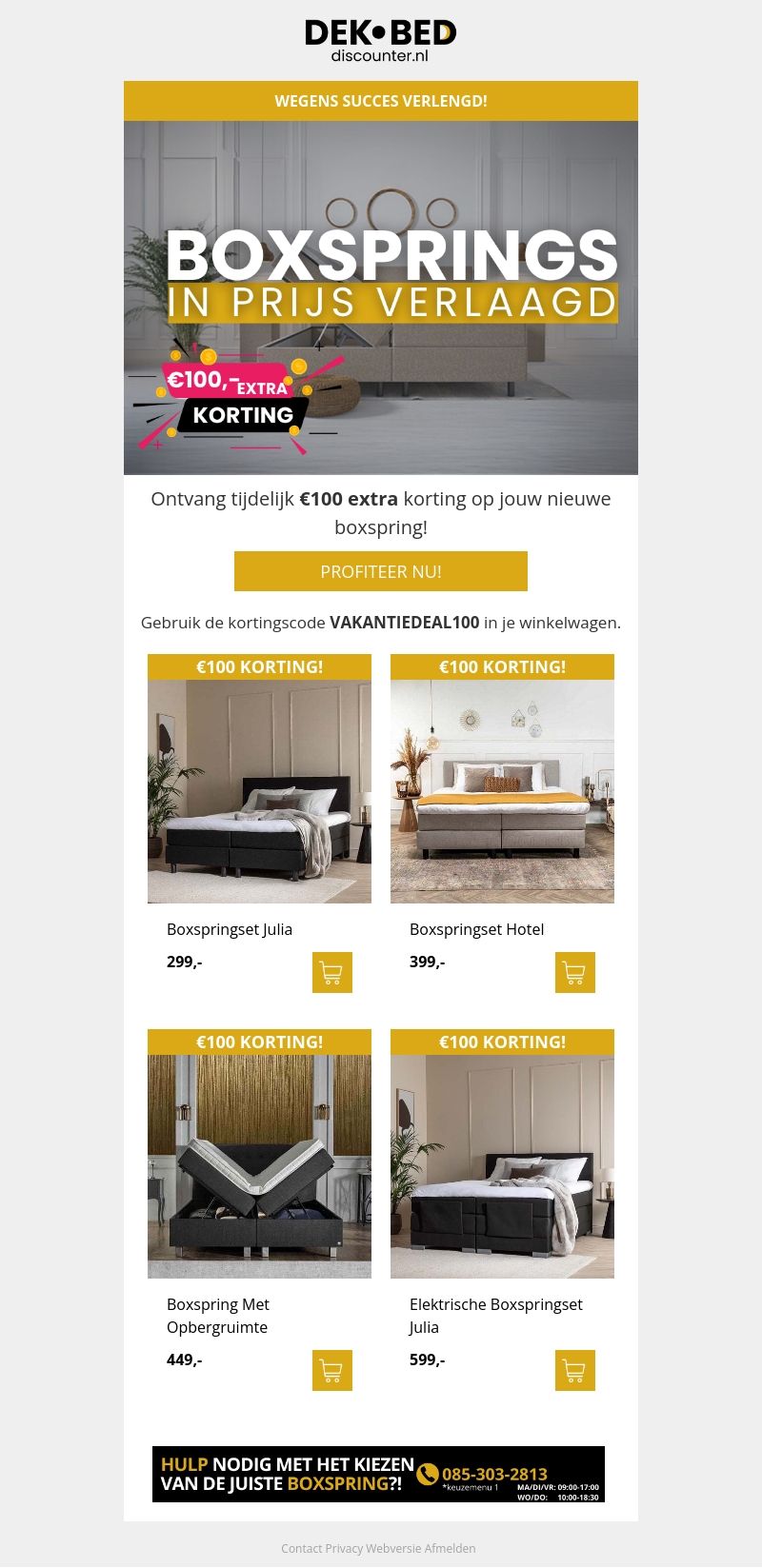 Wegens succes verlengd! Krijg tijdelijk €100 extra korting op diverse boxspring modellen bij Dekbed Discounter. Gebruik kortingscode VAKANTIEDEAL100 en bespaar direct op jouw aankoop! Profiteer nu van deze geweldige aanbieding op Boxspring Julia, Boxspring Hotel en meer.