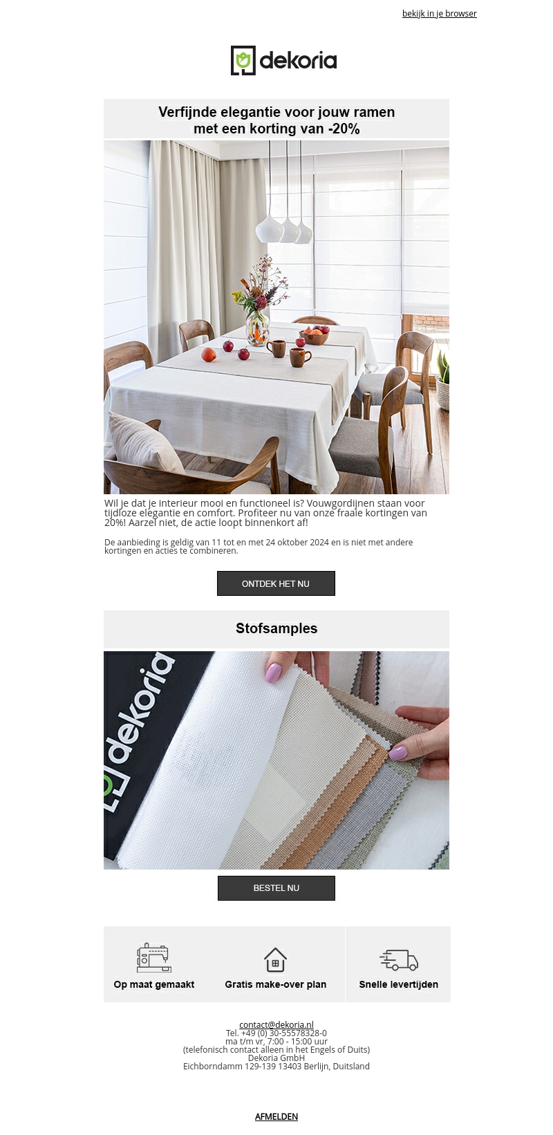 Wil je jouw interieur mooier en functioneler maken? Kies voor onze elegante vouwgordijnen met een korting van 20%! Deze aanbieding is tijdelijk geldig van 11 t/m 24 oktober 2024. Aarzel niet om te profiteren van deze exclusieve kans om je huis te verfraaien. De vouwgordijnen zijn een perfecte mix van stijl en comfort. Mis deze kans niet, de voorraad is beperkt!
