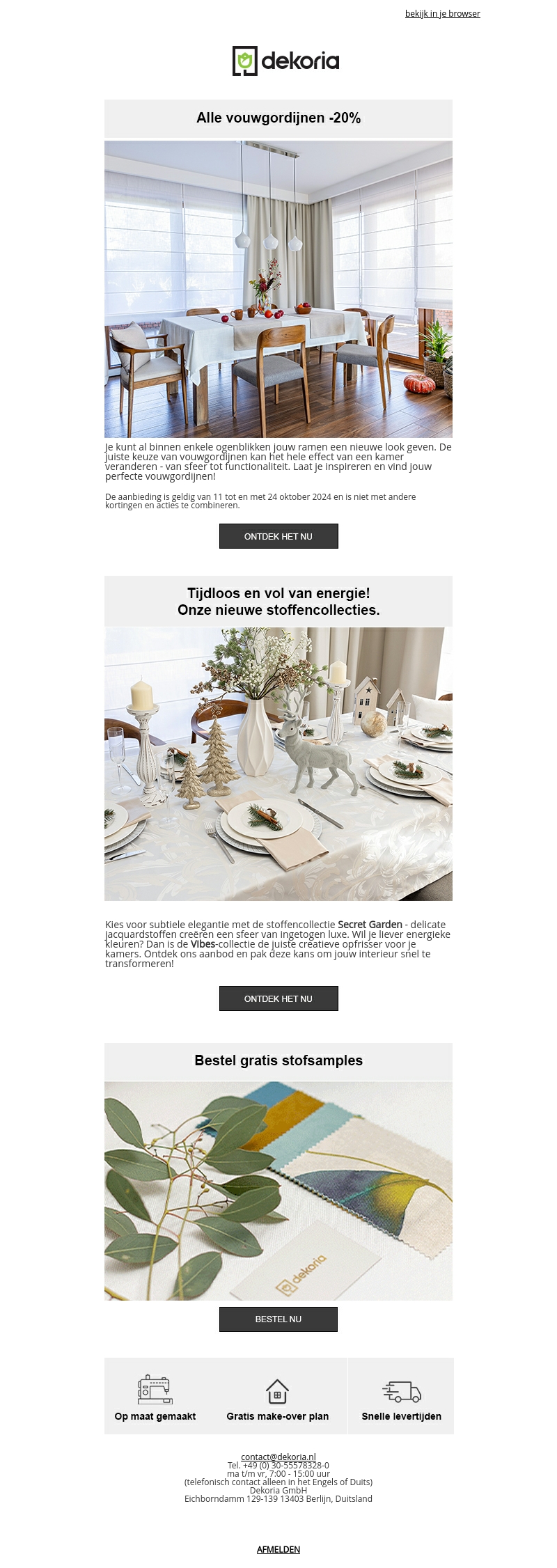 Geef je ramen een frisse en stijlvolle upgrade met onze vouwgordijnen. Profiteer van 20% korting en ontdek onze nieuwe stoffencollecties. Kies uit het elegante Secret Garden of het energieke Vibes voor een unieke sfeer. Actie geldig tot 24 oktober 2024.