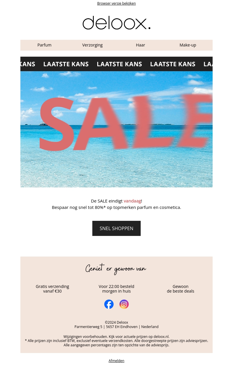 De SALE eindigt vandaag! Bespaar nu tot 80% op topmerken parfum en cosmetica. Snel shoppen voor deze ongelooflijke kortingen verdwenen zijn. Geniet van gratis verzending vanaf โฌ30 en morgen in huis als je voor 22:00 bestelt. Pak deze kans om jouw favorieten voor minder te krijgen!