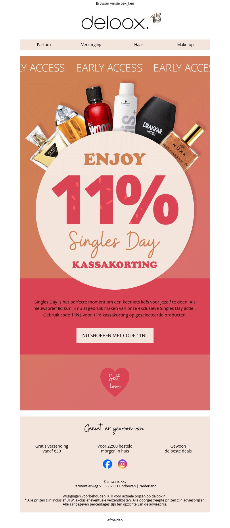Vier Singles Day bij Deloox met exclusieve 11% kassakorting voor nieuwsbriefleden. Profiteer van fantastische kortingen en geniet van gratis verzending vanaf โฌ30. Wees er snel bij, want de actie geldt alleen op geselecteerde producten en eindigt binnenkort. Mis deze kans niet om jezelf te verwennen!