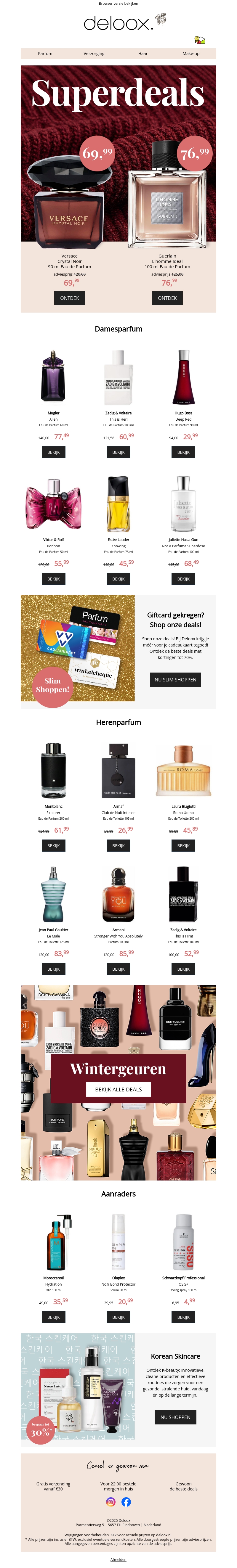 Mis deze unieke korting op topmerken zoals Versace, Yves Saint Laurent en meer niet. Dames- en herenparfums zijn sterk afgeprijsd. Onze speciale selectie biedt u de perfecte geur voor elk seizoen. Profiteer daarnaast van fantastische wintergeuren. Ontdek ook onze Koreaanse huidverzorging voor een stralende huid.