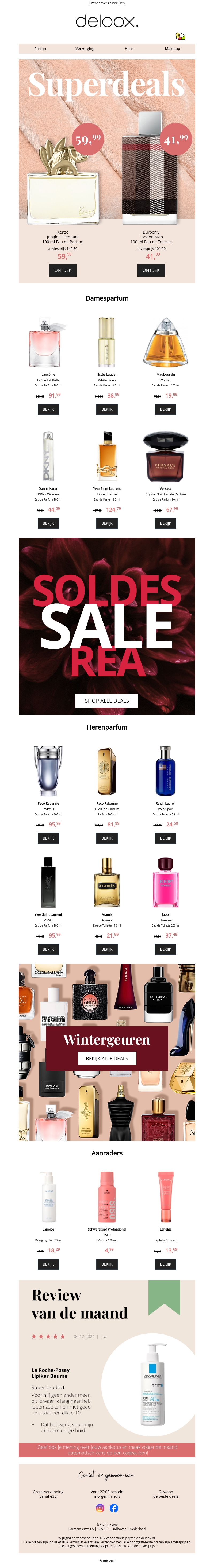 Beleef de ultieme besparingen met onze superdeals op dames- en herenparfums. Met kortingen van wel 50%, vind je zeker een geur die bij je past. Vergeet niet onze speciale wintergeuren en de review van de maand te bekijken. Profiteer snel van deze geweldige aanbiedingen en maak je klaar voor Valentijnsdag.