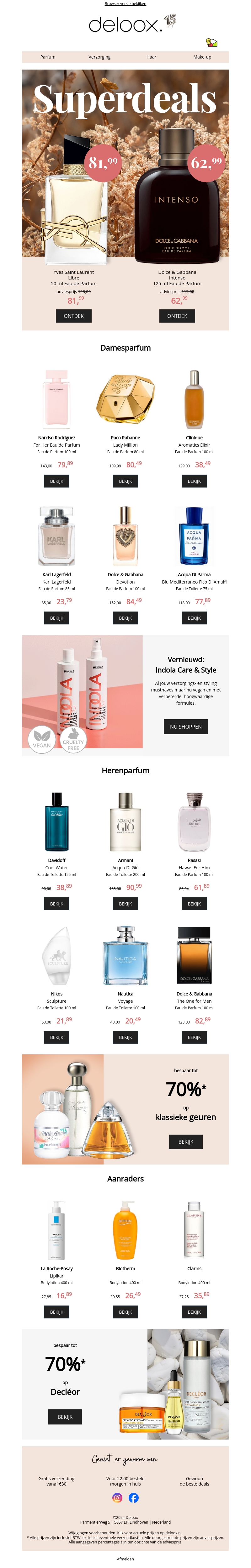 Ontdek de beste deals van 12-09-2024 op dames- en herenparfum. Bespaar tot 70% op toonaangevende geuren. Bekijk de nieuwste collectie van merken zoals Nandoo, Paco Rabanne, Davidoff, en meer. Mis het niet en shop nu voordelig.